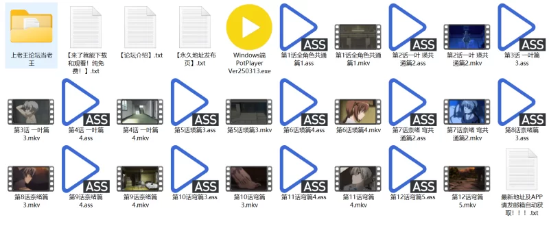 自整理的2k缘之空番剧资源,加上收藏的弹幕文件。是视频弹幕不是单纯的字幕,效果如图。需要用专门的视频软件打开,比如我附带的potplayer软件,点开EXE安装或者自己去网上下一个都行。