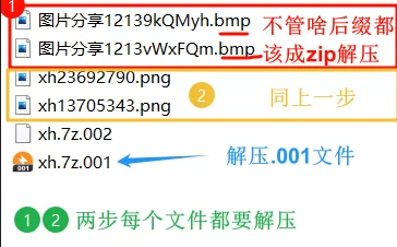 将两个文件下载到同一文件夹,将两个文件的.bmp或者.png改为.zip解压,重复两次,分别得到001和002,再解压001文件