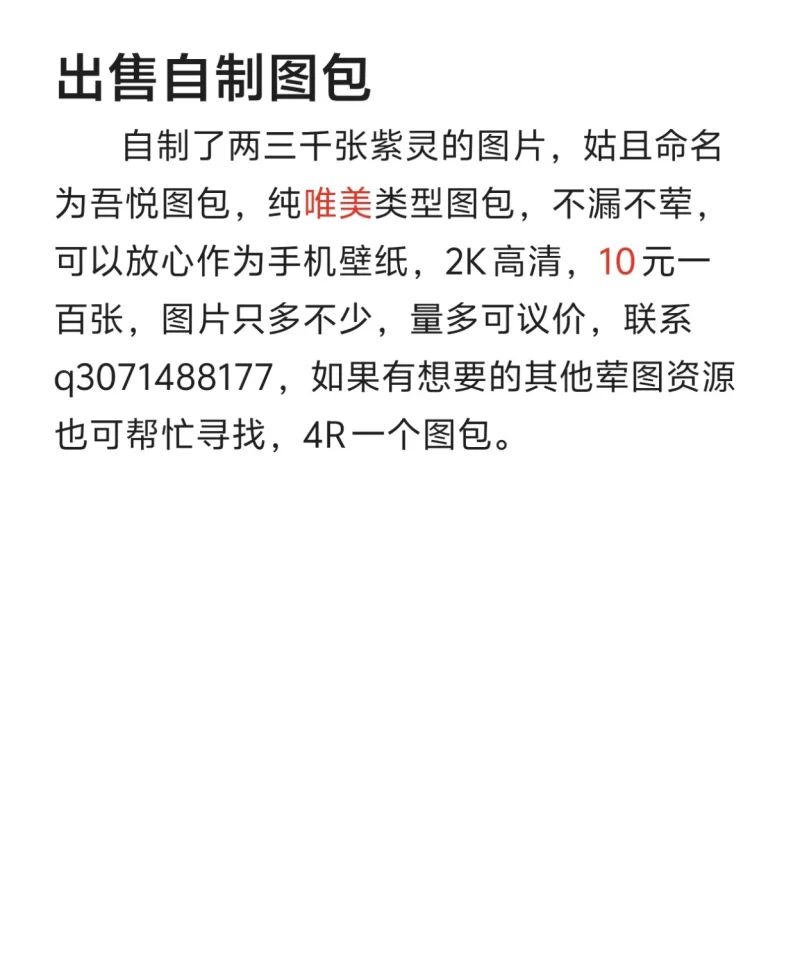 自制的唯美吾悦图包,目前保有紫灵两三千张,梅凝一千多张,2k高清,可做手机壁纸,可议价,欢迎老板加Q咨询!!!
