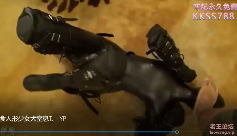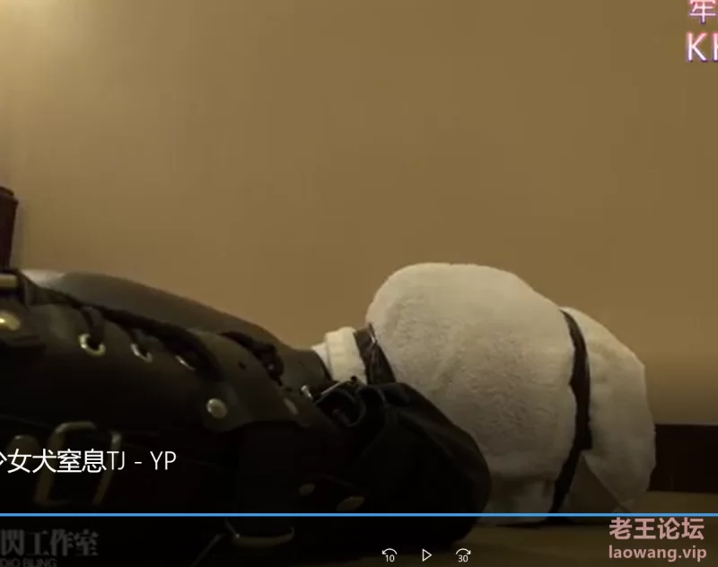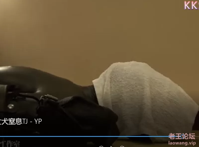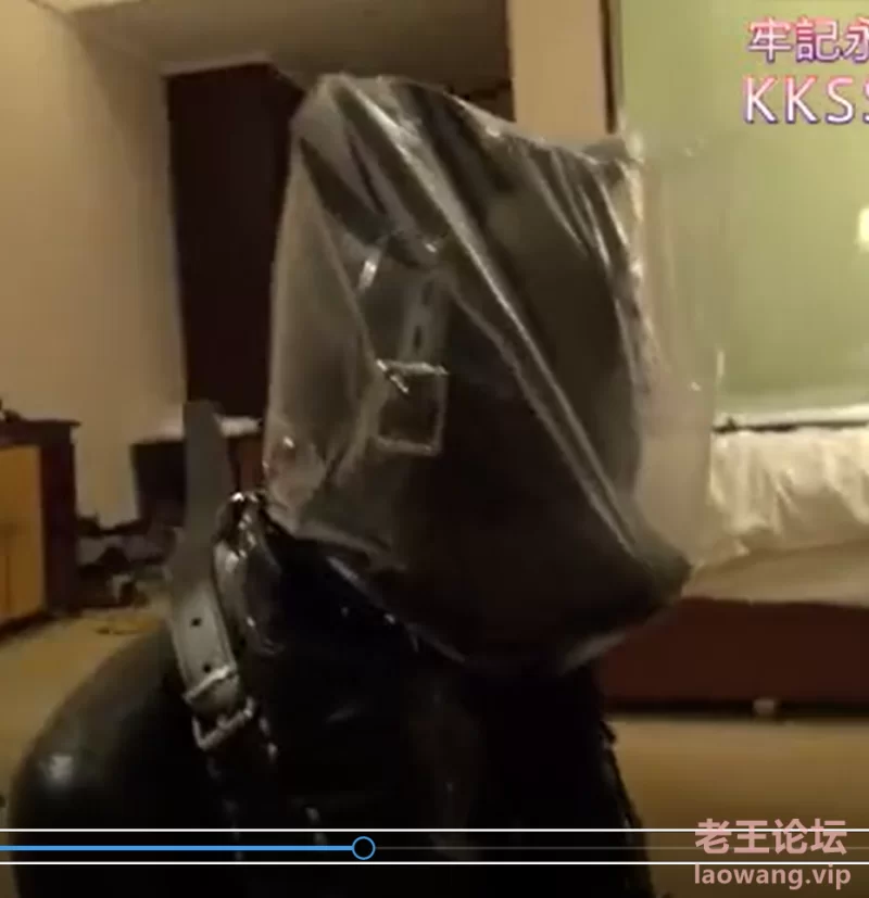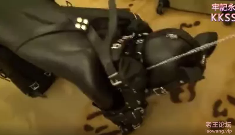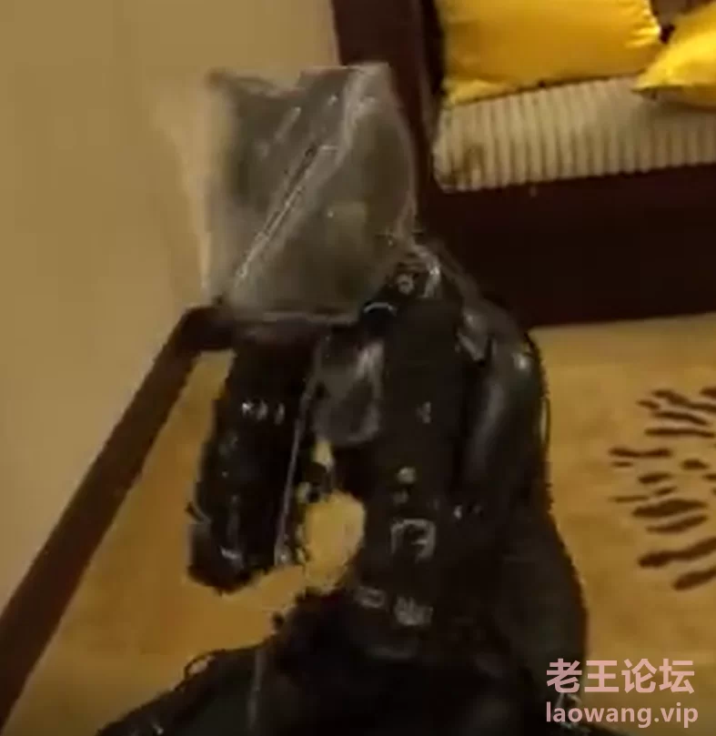 全身皮衣,头戴皮质狗面具,手脚束缚用膝盖和手肘移动。塑料袋密封锁喉窒息。头盖双层湿毛巾胶带密封窒息,同时使用震动棒隔皮衣捏乳头。脚踩口鼻脖子。