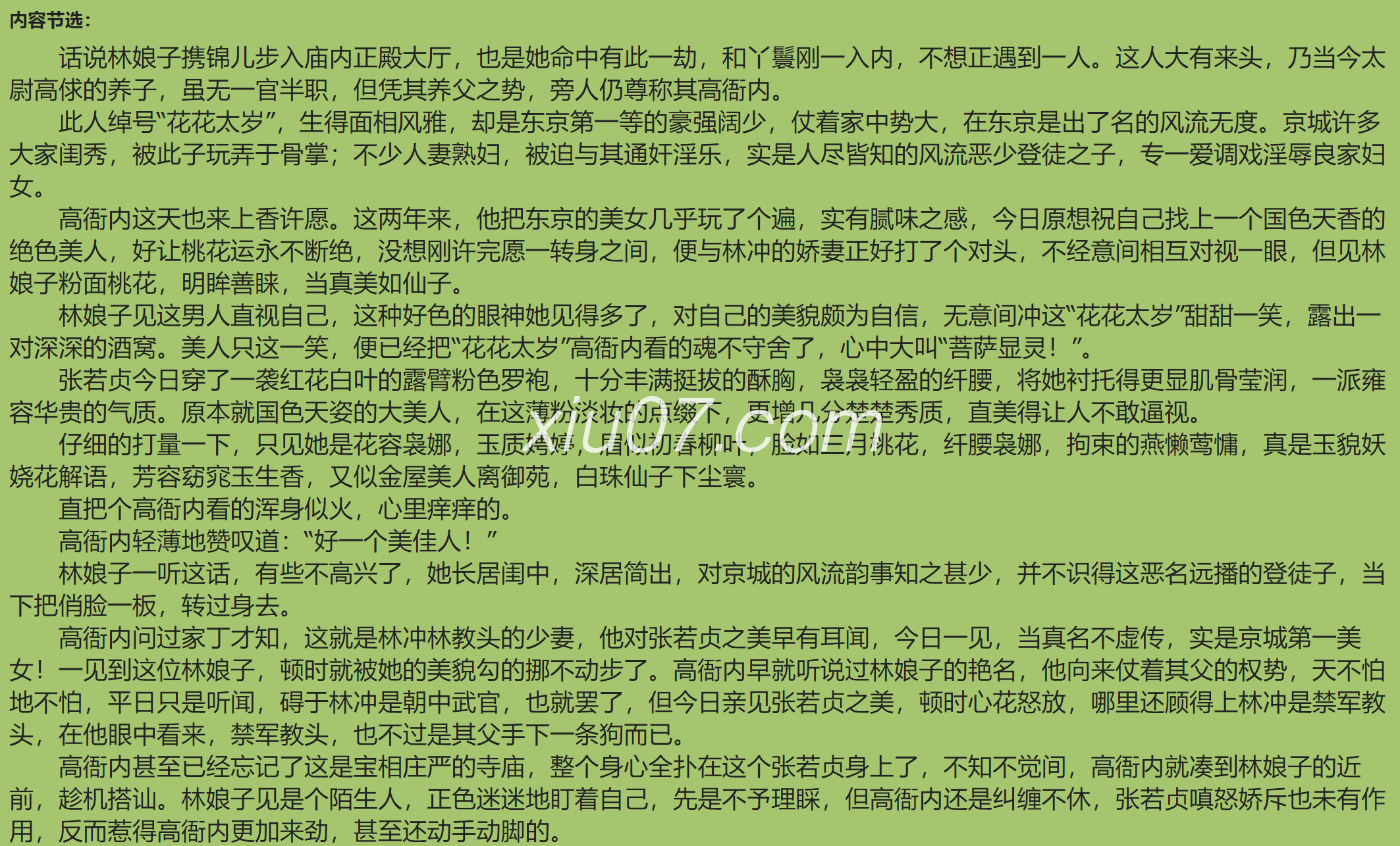 甚至在《三国演义》中,从貂婵、邹氏、小乔(揽二乔于东南兮,乐朝夕之与共)等女子身上,也隐约流露出这层意思。但纵观水浒,似乎有一个例外,就是林冲的娘子。按理,对这样一个例外,作者应该大肆讴歌才对,但原著中,除了寥寥几笔描述,对林娘子似乎没有任何赞美之意,甚至连林娘子的全名都没给后人留下,让人百思不得其解。
